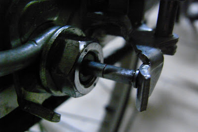 我切換到中段,發現一個問題,並沒有停在桿子中間的那一圈,所以我試著找出可以調線的鬆緊的地方,最後發現這裡如下的照片,中間的細六角帽,可以調整線的鬆緊度。